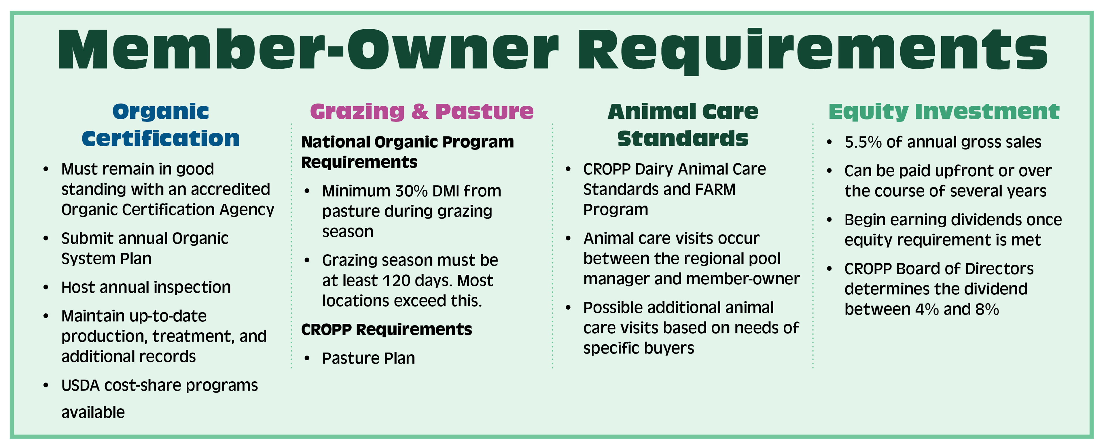 To be a member of the Dairy Pool at Organic Valley, all farms must be certified organic and be able to ship a minimum of 1,000 pounds of milk every other day.